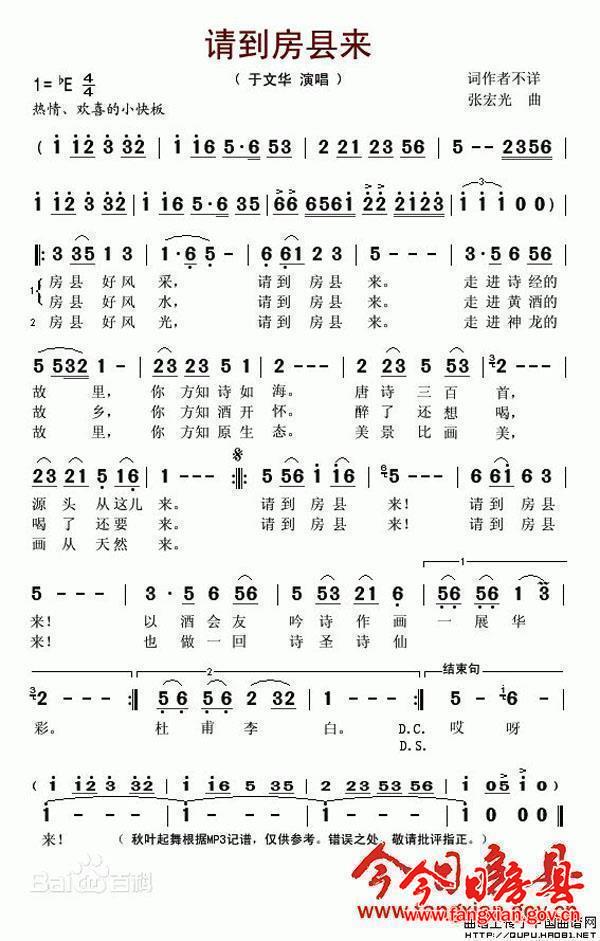 《請到房縣來》是專門配合2010年房縣詩經文化節(jié)創(chuàng)作的主題曲,由著名歌手于文華演唱。自2004年、2005年以來,房縣的“詩經民歌”令外界大為驚嘆的同時,也得到了當地政府的重視。2007年,房縣出臺《房縣民間藝人資格評審暫行辦法》,對在當地有一定影響力的民間藝人建檔立案;該縣還創(chuàng)建了53個民間文化保護示范村,建起25個民歌堂……2010年8月,首屆中國(房縣)詩經文化節(jié)開幕,萬人齊誦“關關雎鳩”,預示著詩祖故里將重放光芒!