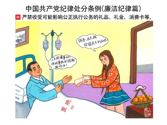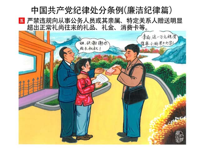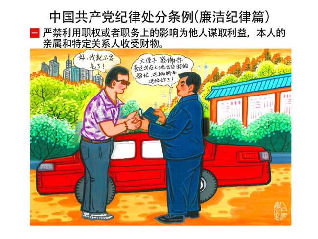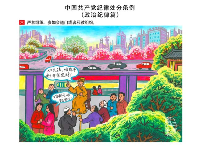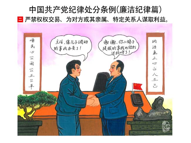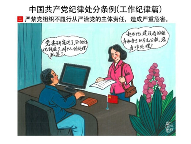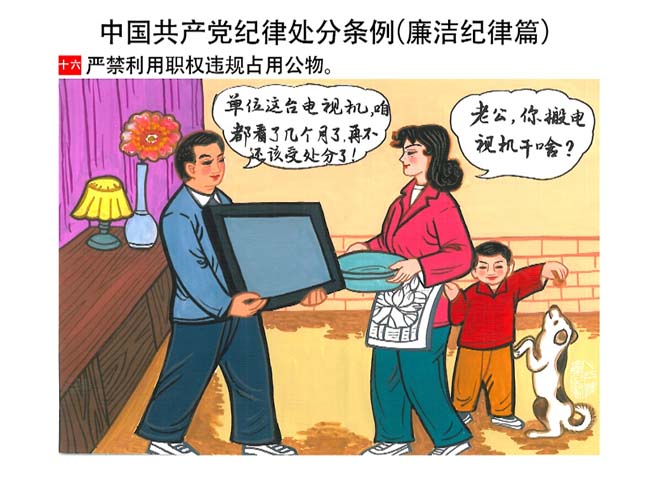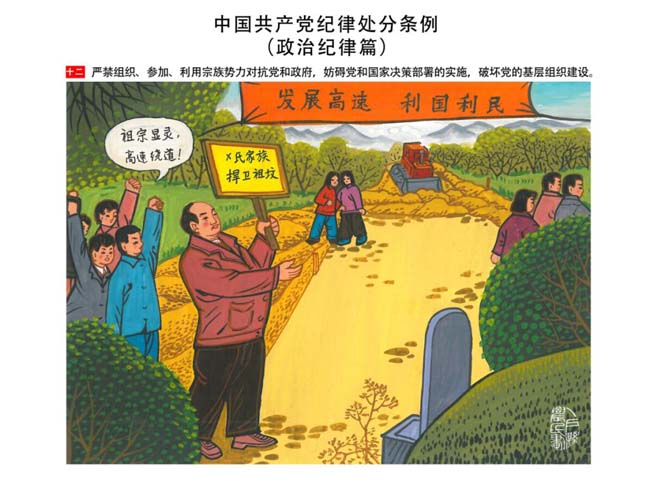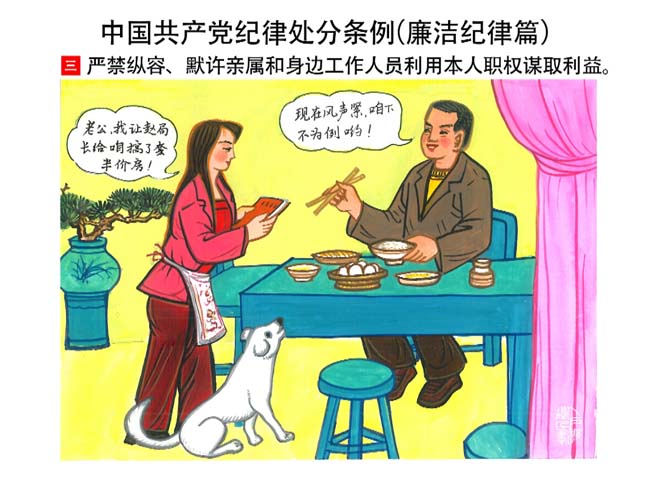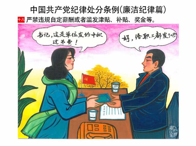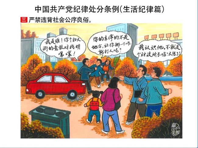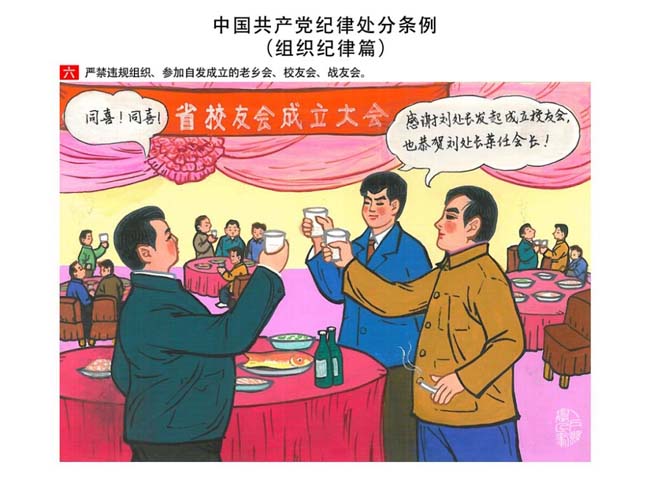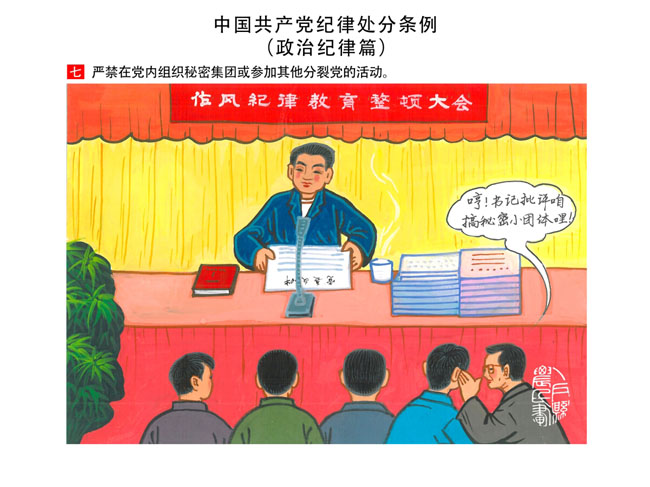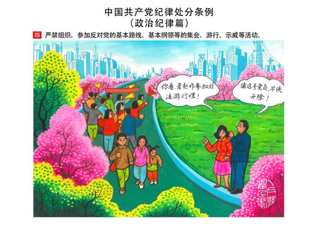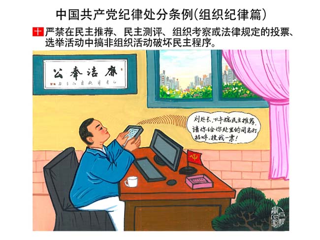 編者按:新修訂的《中國共產(chǎn)黨紀(jì)律處分條例》,將黨章和其他主要黨內(nèi)法規(guī)對(duì)黨組織和黨員的紀(jì)律要求細(xì)化,充分體現(xiàn)了黨紀(jì)嚴(yán)于國法。在“分則”原來以破壞社會(huì)主義市場(chǎng)經(jīng)濟(jì)秩序等為主的十類違紀(jì)行為,整合規(guī)范為政治紀(jì)律、組織紀(jì)律、廉潔紀(jì)律、群眾紀(jì)律、工作紀(jì)律和生活紀(jì)律等六類,使《條例》的內(nèi)容真正回歸黨的紀(jì)律,為廣大黨員開列了一份“負(fù)面清單”。 為幫助廣大黨員干部進(jìn)一步學(xué)習(xí)、掌握黨內(nèi)法規(guī),清楚底線、明白規(guī)矩,縣紀(jì)委推出“農(nóng)民畫解讀‘六大紀(jì)律’”系列,以供大家學(xué)習(xí)。