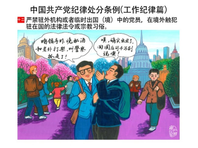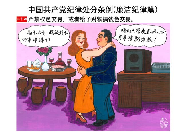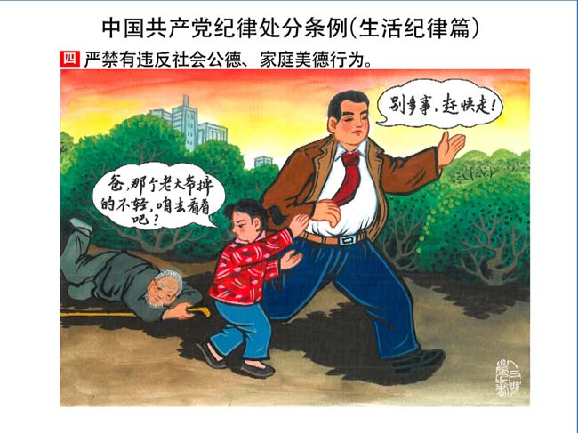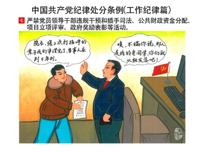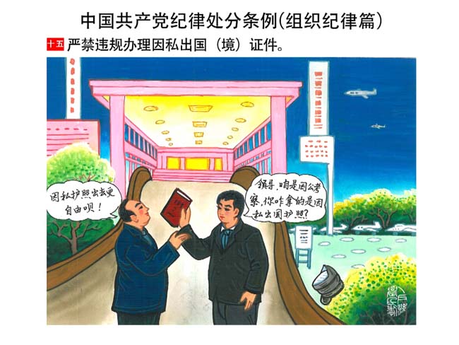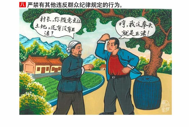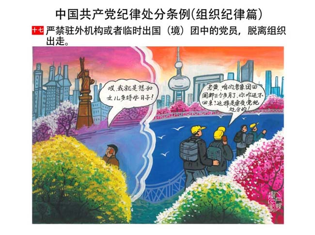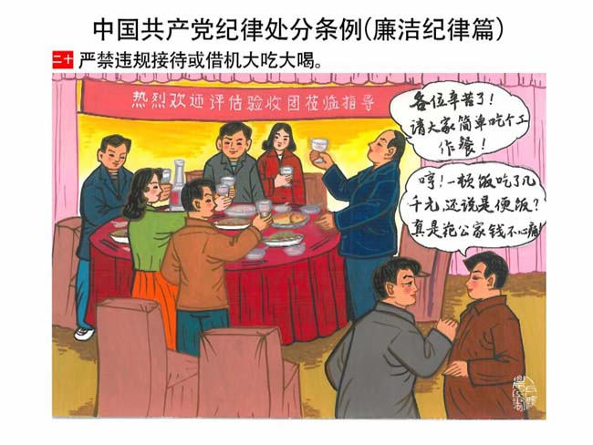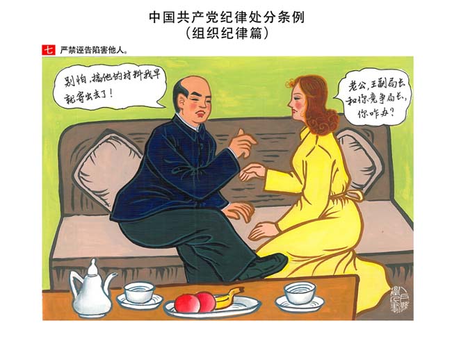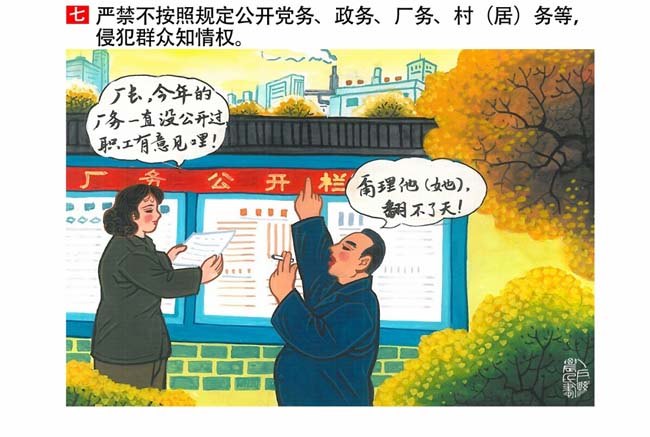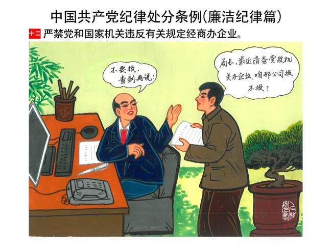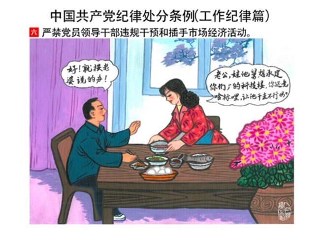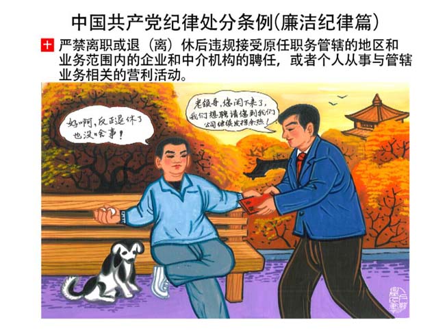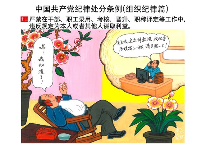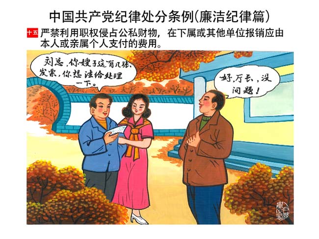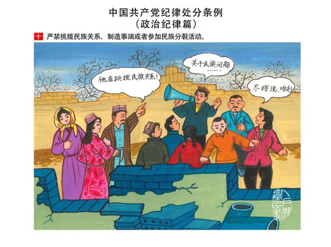 編者按:新修訂的《中國共產(chǎn)黨紀(jì)律處分條例》,將黨章和其他主要黨內(nèi)法規(guī)對(duì)黨組織和黨員的紀(jì)律要求細(xì)化,充分體現(xiàn)了黨紀(jì)嚴(yán)于國法。在“分則”原來以破壞社會(huì)主義市場(chǎng)經(jīng)濟(jì)秩序等為主的十類違紀(jì)行為,整合規(guī)范為政治紀(jì)律、組織紀(jì)律、廉潔紀(jì)律、群眾紀(jì)律、工作紀(jì)律和生活紀(jì)律等六類,使《條例》的內(nèi)容真正回歸黨的紀(jì)律,為廣大黨員開列了一份“負(fù)面清單”。 為幫助廣大黨員干部進(jìn)一步學(xué)習(xí)、掌握黨內(nèi)法規(guī),清楚底線、明白規(guī)矩,縣紀(jì)委推出“農(nóng)民畫解讀‘六大紀(jì)律’”系列,以供大家學(xué)習(xí)。