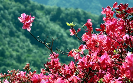 就在這遲暮晚鐘聲中,好像春花已在向人們謝幕收?qǐng)隽耍瑳]有,好戲還在后頭呢!在眾目睽睽之下,幾聲杜鵑鳥的催鳴,那滿山的杜鵑花緊鑼密鼓的唱開了。他們顯擺著、堅(jiān)守著春光春色,把春天這場(chǎng)戲演繹得正出彩正完美呢!