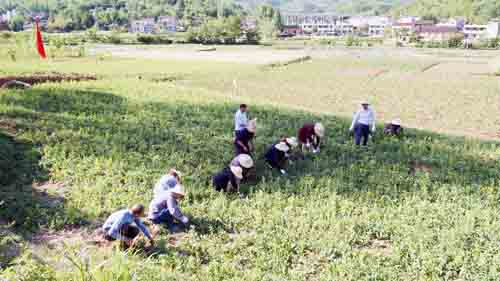 軍店鎮(zhèn)中心衛(wèi)生院精準(zhǔn)扶貧工作隊進(jìn)駐小峪村以來,積極為精準(zhǔn)扶貧對象制定脫貧規(guī)劃,解決生產(chǎn)生活的困難,發(fā)展村級經(jīng)濟(jì)。年初,工作隊為貧困戶蔡靈群制定了脫貧計劃,今年種植桔梗2畝。春播時工作隊為該戶購買了13公斤桔梗種子,并指導(dǎo)蔡靈群在自己的閑置旱地里進(jìn)行了種植。同時蔡靈群也是易地搬遷分散安置對象,老蔡這段時間正在忙于建房, 沒有時間到藥材里鋤草。駐村工作隊長張紹彥發(fā)現(xiàn)老蔡地里的桔梗長勢很好,就是雜草較多,如果不及時出掉雜草,今年的桔梗肯定會減產(chǎn),那老蔡今年的脫貧計劃就會紙上談兵。讓老蔡雇人除草吧,當(dāng)下農(nóng)村的閑散勞動力很少。張紹彥沒有多想,就組織了衛(wèi)生院的12個醫(yī)護(hù)人員來到了貧困戶蔡靈群的桔梗地里鋤草,于是就出現(xiàn)了開頭的一幕。