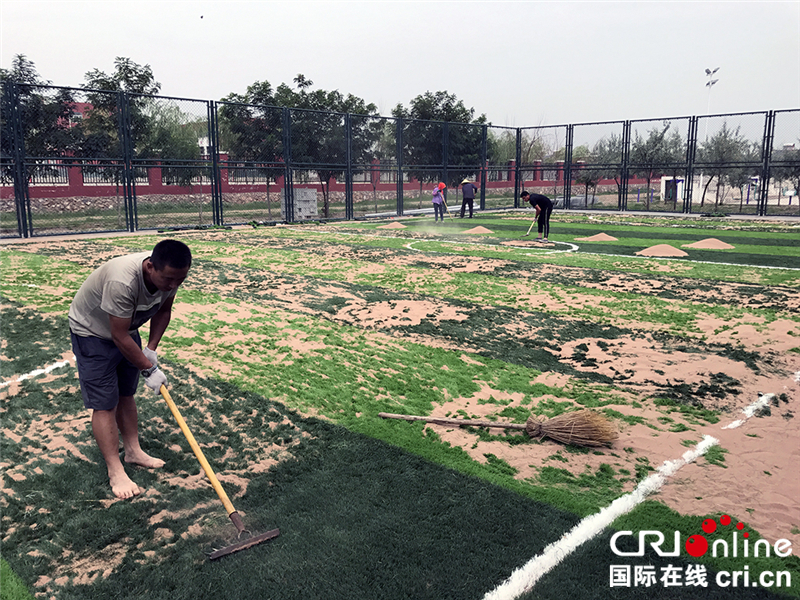 村民正在鋪設人造草皮足球場