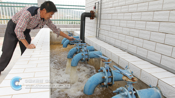 管理人員在軍店鎮(zhèn)三溪溝村水廠開閘釋放清洗蓄水池的水