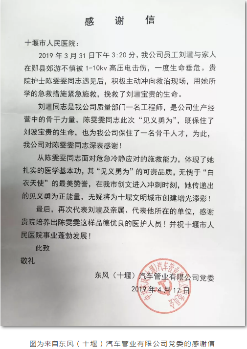 “貴院陳雯雯同志面對危機冷靜應對的施救能力,體現(xiàn)了扎實的醫(yī)學基本功。其見義勇為的可貴品質,無愧于白衣天使的最美贊譽。在我市創(chuàng)文進入創(chuàng)文沖刺時刻,她傳遞出的見義勇為正能量,無疑將為十堰文明城市創(chuàng)建增光添彩。”4月19日,十堰市人民醫(yī)院收到來自東風(十堰)汽車管業(yè)有限公司黨委的一封特殊的感謝信。