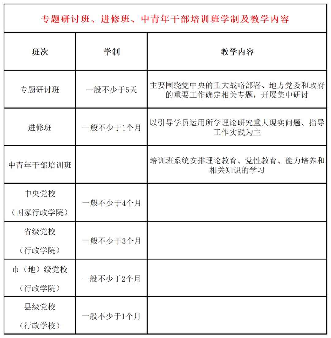 同時,《條例》對進(jìn)修班、培訓(xùn)班、理論研修班、專題研討班等主要教學(xué)內(nèi)容作出了規(guī)定(見上圖最右列)。