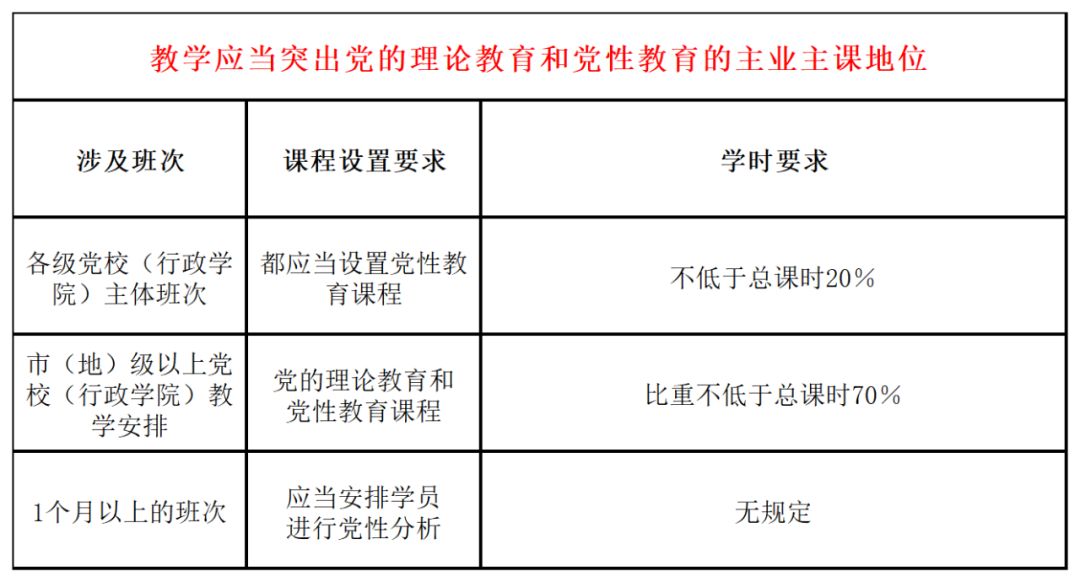 為在教學(xué)中突出黨的理論教育和黨性教育的主業(yè)主課地位,《條例》對相關(guān)班次學(xué)時進(jìn)行了明確規(guī)定。