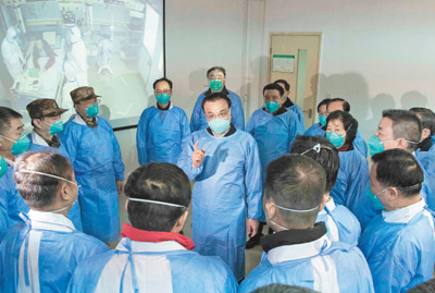 | 1月27日,受習(xí)近平總書記委托,中共中央政治局常委、國務(wù)院總理、中央應(yīng)對新型冠狀病毒感染肺炎疫情工作領(lǐng)導(dǎo)小組組長李克強(qiáng)赴武漢考察指導(dǎo)疫情防控工作,代表黨中央、國務(wù)院慰問疫情防控一線的醫(yī)務(wù)人員。這是李克強(qiáng)在武漢金銀潭醫(yī)院和來自全國各地、軍隊支援武漢的醫(yī)生交流。 |