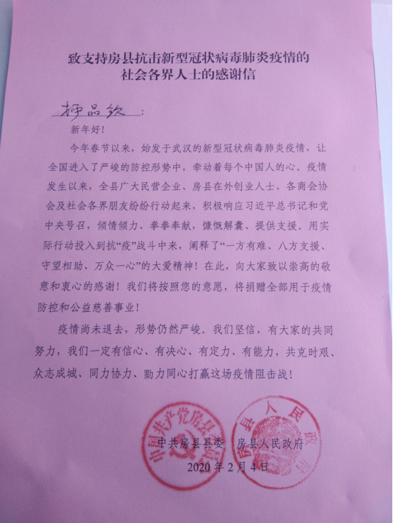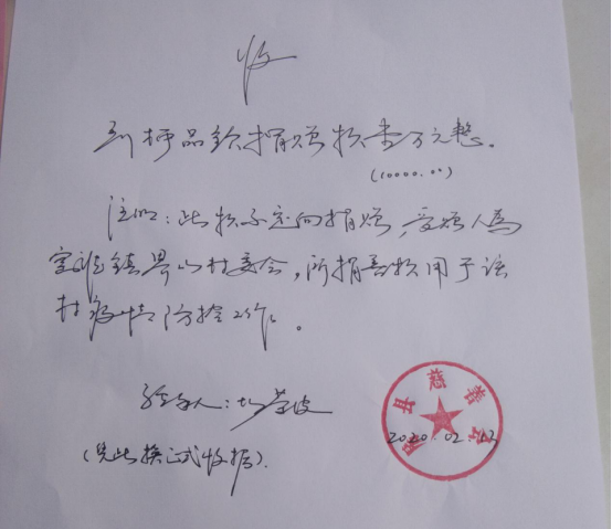 帶著老人的囑托,在縣老干部局工作人員向房縣慈善會說明老人的捐款意圖后,在場的所有人員無不為柯老的家國情懷和大公無私的奉獻(xiàn)精神所感動,房縣慈善會工作人員雙手接過這筆沉甸甸的善款,對老人的善舉表達(dá)了深深地謝意,并表示會遵從老人的意愿,第一時間將這筆善款撥付給窯淮鎮(zhèn)界山村委會用于疫情防控,隨后為老人出具了收據(jù)及感謝信。