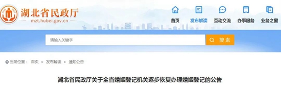 湖北省民政廳關于全省婚姻登記機關逐步恢復辦理婚姻登記的公告