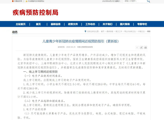 4月25日,為指導(dǎo)疫情期間兒童青少年近視預(yù)防,國(guó)家衛(wèi)健委發(fā)布了《兒童青少年新冠肺炎疫情期間近視預(yù)防指引(更新版)》,國(guó)家衛(wèi)健委對(duì)中小學(xué)生線上學(xué)習(xí)時(shí)間做出限制,小學(xué)生每天不超過(guò)2.5小時(shí),每次不超過(guò)20分鐘;中學(xué)生每天不超過(guò)4小時(shí),每次不超過(guò)30分鐘。減少線上學(xué)習(xí)外的視屏?xí)r間,除教育部門安排的線上教育時(shí)間外,其他用途的視屏?xí)r間每天累計(jì)不超過(guò)1小時(shí)。