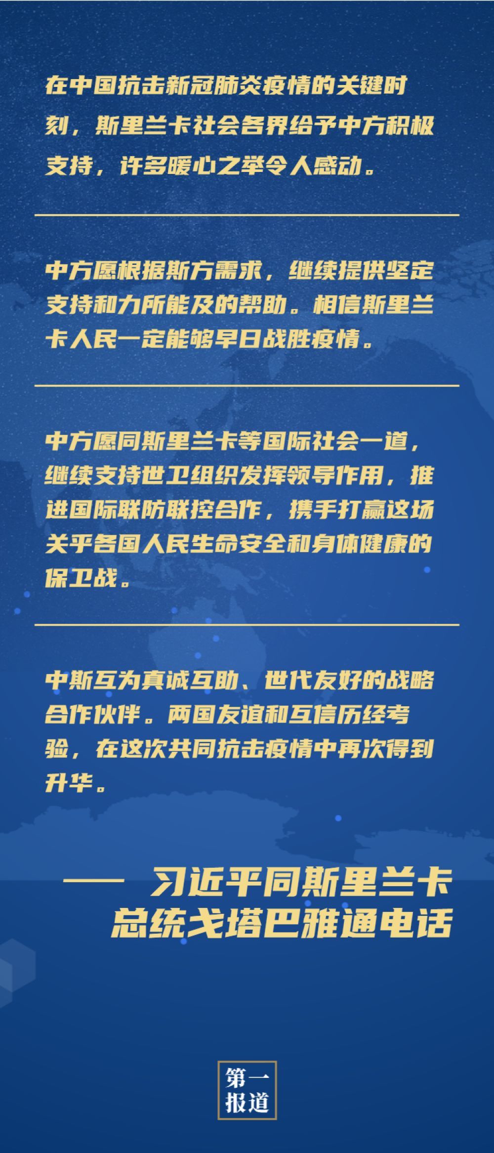 習(xí)近平指出,在中國抗擊新冠肺炎疫情的關(guān)鍵時(shí)刻,斯里蘭卡社會(huì)各界給予中方積極支持,許多暖心之舉令人感動(dòng)。在你強(qiáng)有力領(lǐng)導(dǎo)下,斯里蘭卡有效遏制了疫情擴(kuò)散蔓延。中方愿根據(jù)斯方需求,繼續(xù)提供堅(jiān)定支持和力所能及的幫助。相信斯里蘭卡人民一定能夠早日戰(zhàn)勝疫情。感謝斯里蘭卡政府和人民在疫情期間對在斯里蘭卡的中國公民給予關(guān)照。中方將繼續(xù)保障在華斯里蘭卡公民生命安全和身體健康。中方愿同斯里蘭卡等國際社會(huì)一道,繼續(xù)支持世衛(wèi)組織發(fā)揮領(lǐng)導(dǎo)作用,推進(jìn)國際聯(lián)防聯(lián)控合作,攜手打贏這場關(guān)乎各國人民生命安全和身體健康的保衛(wèi)戰(zhàn)。