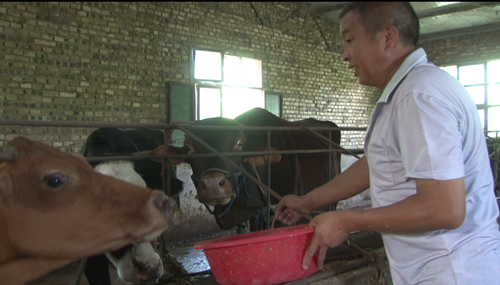 化龍堰鎮(zhèn)上營村建檔立卡戶周邦林:“我拌這個酒渣的目的是叫牛把這個玉米秸稈的節(jié)節(jié)吃完,把這個料都搞干凈,還有就是這個酒渣可以活它的血,可以健它的脾胃,叫它身上不長枯蜱黃。”