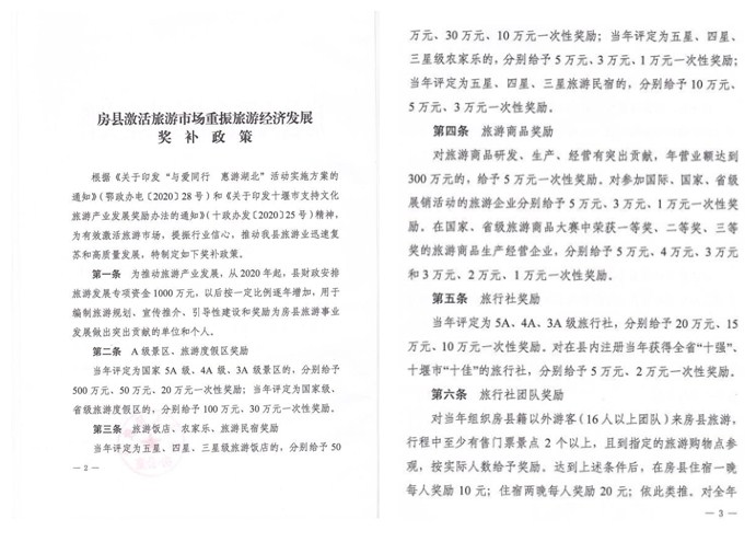 此政策與湖北省“與愛同行?惠游湖北”獎勵政策不沖突,可疊加享受。同時,凡是在2020年12月31日前與房縣簽訂合作協(xié)議的旅行社,獎勵政策在合同期限內(nèi)有效。