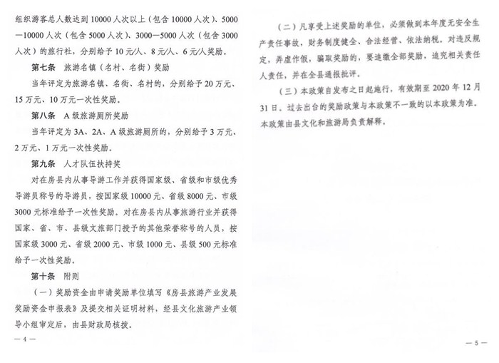 對當(dāng)年組織房縣籍以外游客(16人以上團(tuán)隊)來房縣旅游,行程中至少有售門票景點(diǎn)2個以上,且到指定的旅游購物點(diǎn)參觀,按實際人數(shù)給予獎勵。達(dá)到上述條件后,在房縣住宿一晚每人獎勵10元,住宿兩晚每人獎勵20元……依次類推。