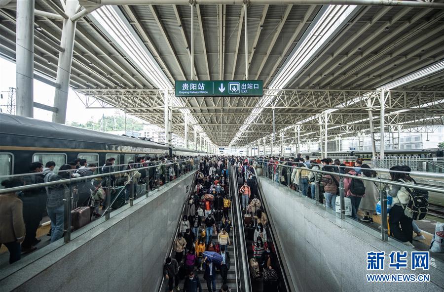 10月7日,長假臨近尾聲,貴陽火車站迎來旅客返程高峰。這是旅客在貴陽火車站準備出站。新華社記者 陶亮 攝