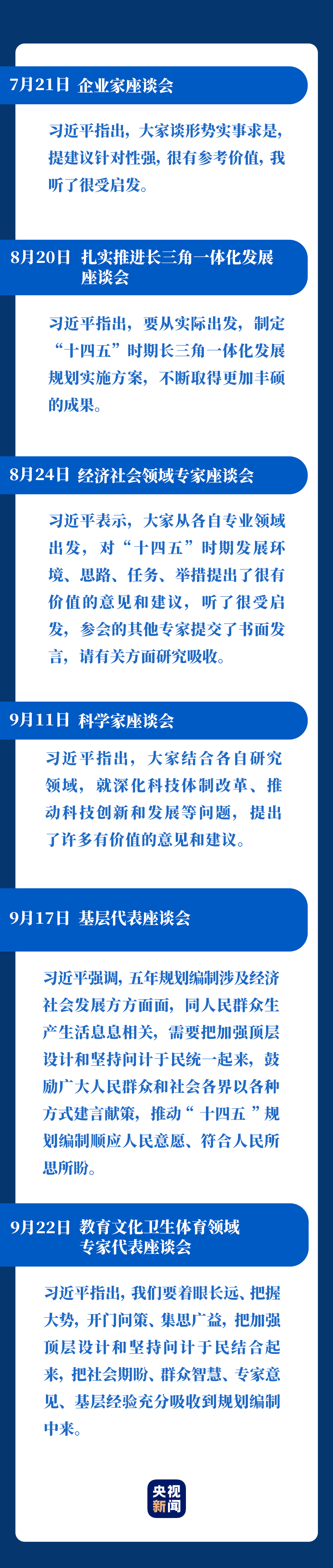 7月下旬到9月下旬,習(xí)近平總書(shū)記主持召開(kāi)多場(chǎng)座談會(huì),以各種方式廣泛聽(tīng)取各方面對(duì)“十四五”規(guī)劃編制的意見(jiàn)和建議。