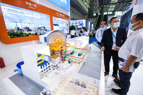 11月11日,在深圳舉行的第二十二屆中國(guó)國(guó)際高新技術(shù)成果交易會(huì)(高交會(huì))上,參觀者在中廣核展臺(tái)了解“華龍一號(hào)”核電技術(shù)。新華社記者 毛思倩 攝