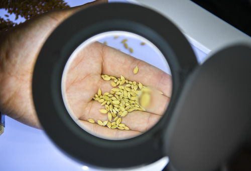 在吉林省吉林市永吉縣一拉溪鎮(zhèn)九月豐家庭農(nóng)場(chǎng),工作人員在實(shí)驗(yàn)室中檢測(cè)一批試種水稻的稻谷外觀(8月12日攝)。新華社記者 許暢 攝
