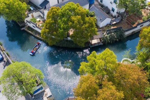 浙江省長(zhǎng)興縣龍山街道渚山村,保潔人員進(jìn)行日常河道護(hù)理巡查(4月9日攝,無(wú)人機(jī)照片)。新華社記者 徐昱 攝