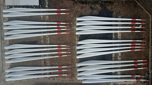 這是河北省威縣一家風(fēng)電設(shè)施生產(chǎn)企業(yè)內(nèi)的大型風(fēng)電機(jī)組葉片(12月8日攝,無(wú)人機(jī)照片)。新華社記者 牟宇 攝