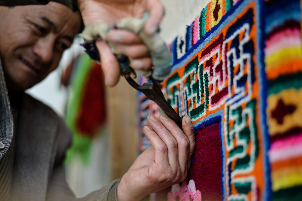 從8歲起就跟著父親洗毛、捻線的加牙藏毯國家級非物質(zhì)文化遺產(chǎn)傳承人楊永良,2013年在政府支持下成為“加牙藏族織毯技藝傳習所”的***。