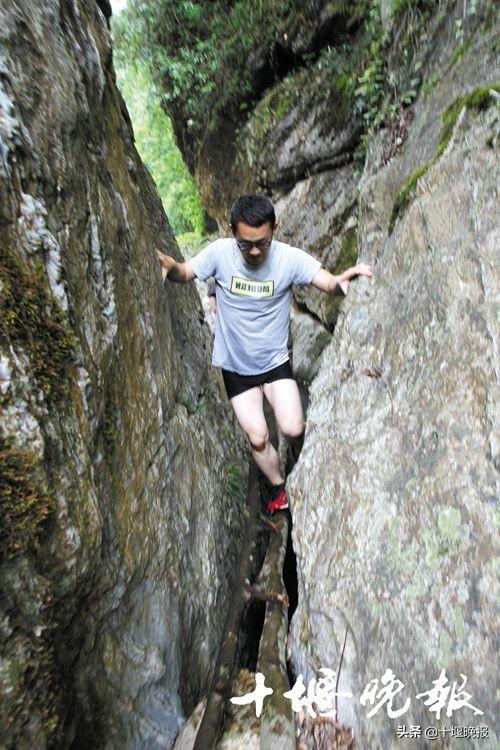 前行約一個小時后,一處落差超過2米的跌水攔住了去路。一行人繞到岸邊,只見一個房屋大小的巨石裂成兩半,中間的縫隙剛好能容一人通過。底部是綠得發(fā)暗的深潭,好在縫隙兩頭搭有兩棵枯樹供人通行。記者背著雙肩包、挎著相機踩上枯樹,雙手抵著石壁小心翼翼地挪動腳步,不料左腳踩的一棵枯樹突然掉落,身體迅速下跌。本能地扭轉(zhuǎn)身體,記者雜耍般地騎在另一棵枯樹上。在眾人的驚呼聲中,確認背包、相機安全后,記者長出了一口氣。
