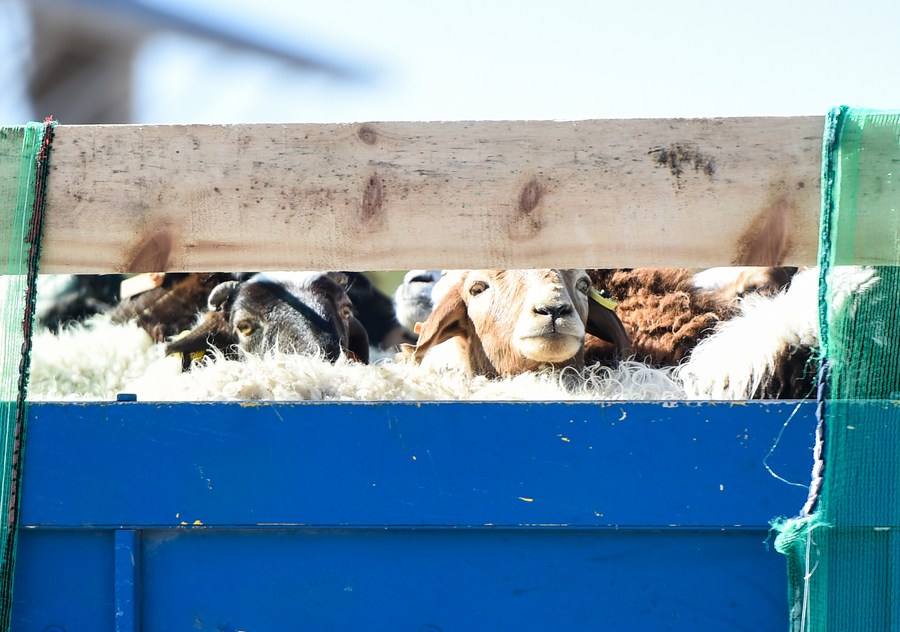 這是2020年10月22日在內(nèi)蒙古二連浩特口岸拍攝的蒙古國捐贈的羊。