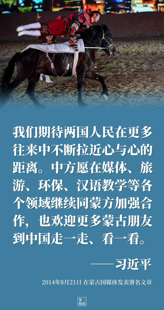 2014年8月21日,在對蒙古國進行國事訪問之際,習(xí)近平主席在蒙古國《日報》、《今日報》、《世紀(jì)新聞報》、《民族郵報》、蒙古新聞網(wǎng)網(wǎng)站發(fā)表署名文章,提出策馬奔向中蒙關(guān)系更好明天的愿景。