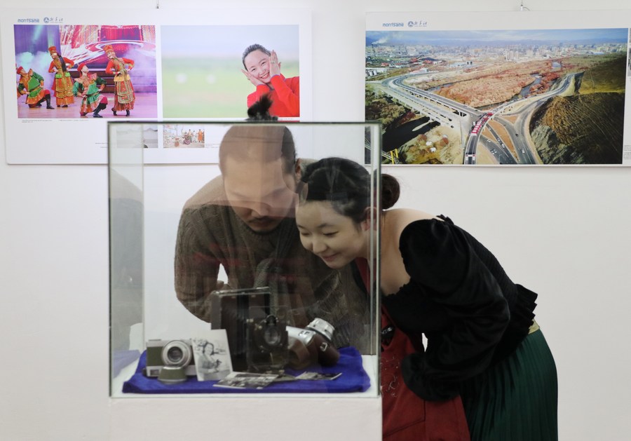 2019年2月23日,在蒙古國首都烏蘭巴托,觀眾們參觀中蒙建交70周年“歷史的足跡”圖片展。