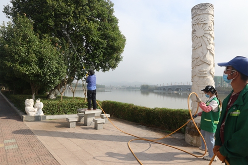 在濱河大道,一輛園林灑水車正在作業(yè),三四名園林工人正相互配合著為行道路上的樹木噴灑藥物。節(jié)日期間,這群忙碌的背影在這個(gè)喜慶的環(huán)境里似乎格外醒目,但對(duì)于他們而言,這個(gè)國慶節(jié)與平時(shí)沒什么不同。