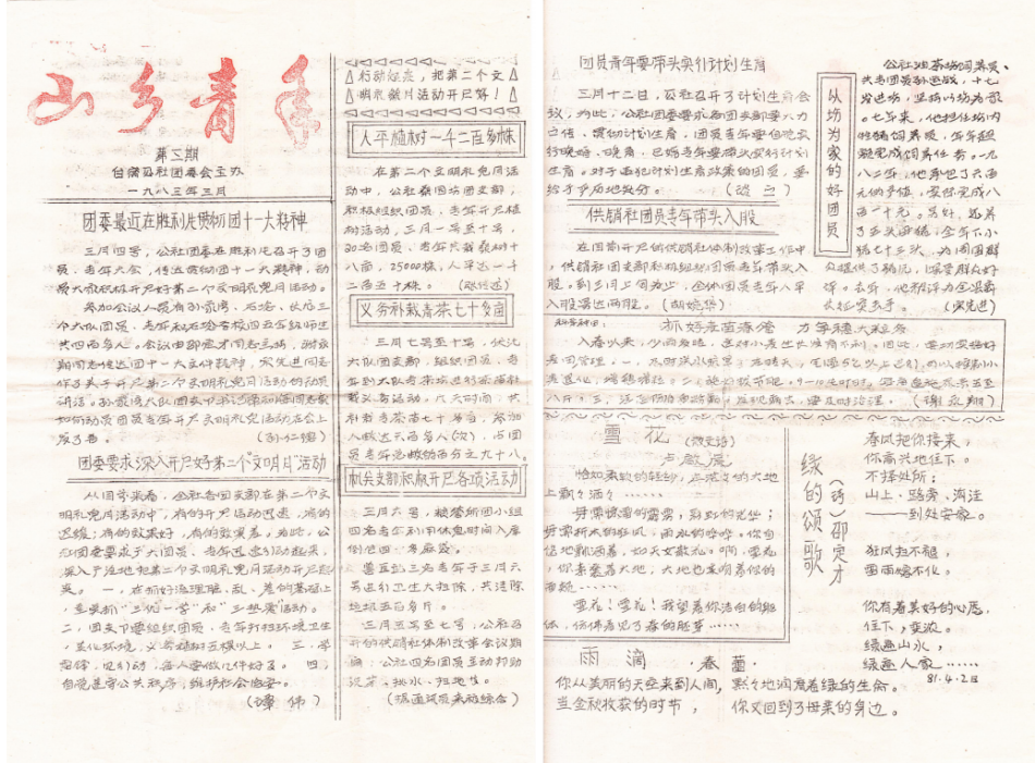 《山鄉(xiāng)青年》主要反映公社各團支部開展活動情況,力求生動活潑,受到廣泛贊揚。據(jù)了解,該團刊稿件一部分來自公社各團支部,一部分由邵定才同志自己撰寫。談及該刊,邵定才同志回憶道,那時候經(jīng)常停電,晚上點著煤油燈編寫稿件,鼻孔常常被油燈熏黑。由于當時辦公條件簡陋,沒有打字機,公文全部油印,辦團刊也是如此。每期團刊稿件編好后,先要用鐵筆在蠟紙上一筆一畫刻字,稍不留神就劃破了蠟紙。推印時也要把握好力度,用力大了紙上墨跡重,用力小了字跡不清楚。一期團刊印完,忙得滿頭是汗。邵定才回憶,那時年輕勁頭足,忙碌一整天也不覺得累。后人民公社被撤銷,各干部被重新分配到各區(qū)、鄉(xiāng)工作,從此天各一方。