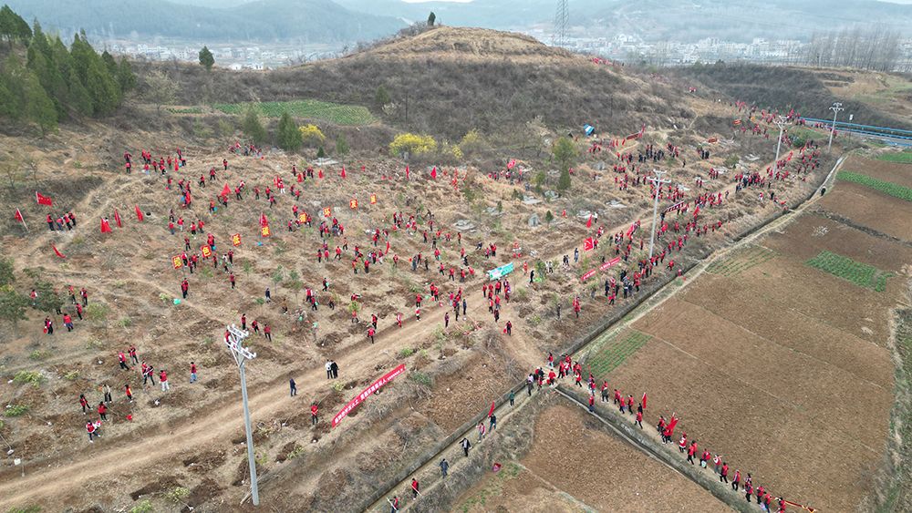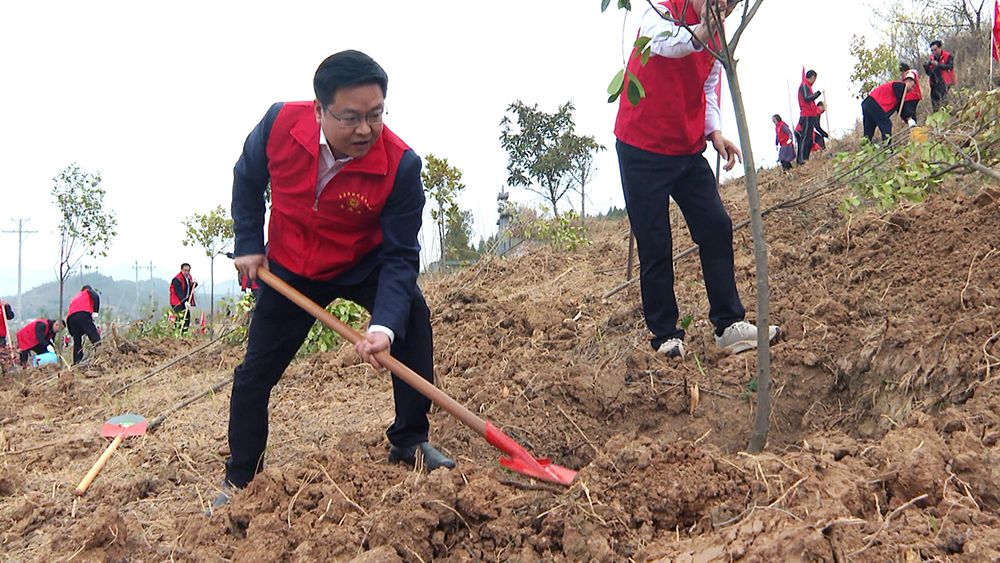 植樹活動現(xiàn)場,紀(jì)道清、謝曉鳴等縣領(lǐng)導(dǎo)與干部群眾一起揮鍬鏟土、培土圍堰、提水澆灌,接連種下紅葉石楠、大葉女貞等多種苗木12000余株,綠化荒山面積110余畝。