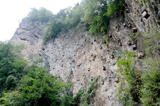 聽(tīng)!“嗡嗡”的聲音在我們的耳邊回旋著,小小的翅膀帶動(dòng)著它們的身體飛到它們最終的“家”;周?chē)牧魉皣W嘩”地流動(dòng)著,無(wú)限循環(huán)著為這一處添加不少生機(jī)??矗∵@懸崖峭壁上居然懸掛著上萬(wàn)個(gè)蜂箱,那種視覺(jué)的震撼是你無(wú)法想象到的。這小小的蜂箱里面居住著成千上萬(wàn)的可愛(ài)的中華蜜蜂,它們無(wú)時(shí)無(wú)刻的在勞動(dòng)著,筑起一道道“堅(jiān)固”的蜂巢,產(chǎn)出那可口的蜂蜜。