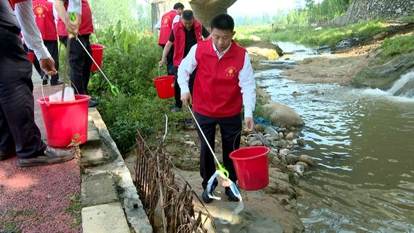 紀道清與干部群眾一起拿著夾子、鏟子、垃圾桶,在河道沿岸、溝渠周邊撿拾漂浮物,清除堵塞物。紀道清察看河流水環(huán)境治理情況,了解河長制落實、防汛工作情況。