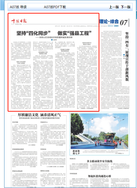 編者按:8月3日,十堰日報(bào)理論綜合版刊發(fā)房縣縣委書記紀(jì)道清撰寫的《堅(jiān)持“四化同步” 做實(shí)“強(qiáng)縣工程”——加快山區(qū)縣域經(jīng)濟(jì)高質(zhì)量跨越發(fā)展初探》文章。文章中說,房縣深入學(xué)習(xí)貫徹黨的二十大和省第十二次黨代會精神,高舉省委市委授予的“綠色低碳循環(huán)發(fā)展示范縣”發(fā)展大旗,以流域綜合治理統(tǒng)籌山區(qū)縣工業(yè)化、信息化、城鎮(zhèn)化、農(nóng)業(yè)現(xiàn)代化同步發(fā)展,跑出了“強(qiáng)縣工程”加速度。