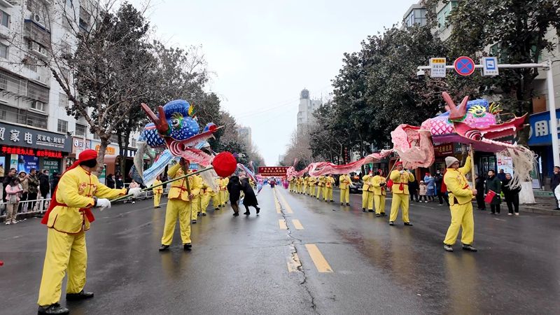 上午9時許,伴隨著熱鬧的鑼鼓聲,巡游隊伍從唐城廣場出發(fā),經(jīng)房陵大道、武當路至孫家灣橋頭。在隊伍最前方的是非遺表演“舞龍燈”,兩條七彩巨龍追逐著龍珠,沿街一路翻轉(zhuǎn)騰飛表演,把龍的神氣、龍的精神表現(xiàn)得淋漓盡致,引得觀眾紛紛喝彩。