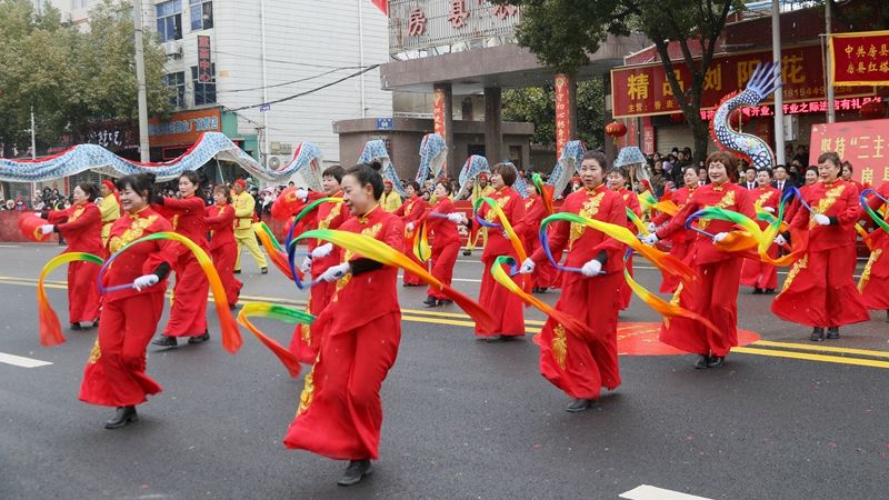 威風鑼鼓震天響,縣住建局、縣城管執(zhí)法局66人邁著鏗鏘的步伐,打著昂揚的鼓點,為廣大市民送上了一場氣勢恢宏、酣暢淋漓的鑼鼓表演盛宴。舞獅子、劃旱船、扭秧歌、腰鼓舞等傳統(tǒng)民俗節(jié)目精彩登場。其中,由縣文旅局組織的106人參演的《一龍帶九蛟》節(jié)目最為壯觀,群龍舞動,金光閃閃,矯健如飛,栩栩如生,喜慶的節(jié)日氣氛撲面而來,《房縣的故事說不完》《魚躍龍門》《舞起魚燈鬧豐收》等舞蹈表演充分展示了房縣歷史文化和民間藝術(shù)。
