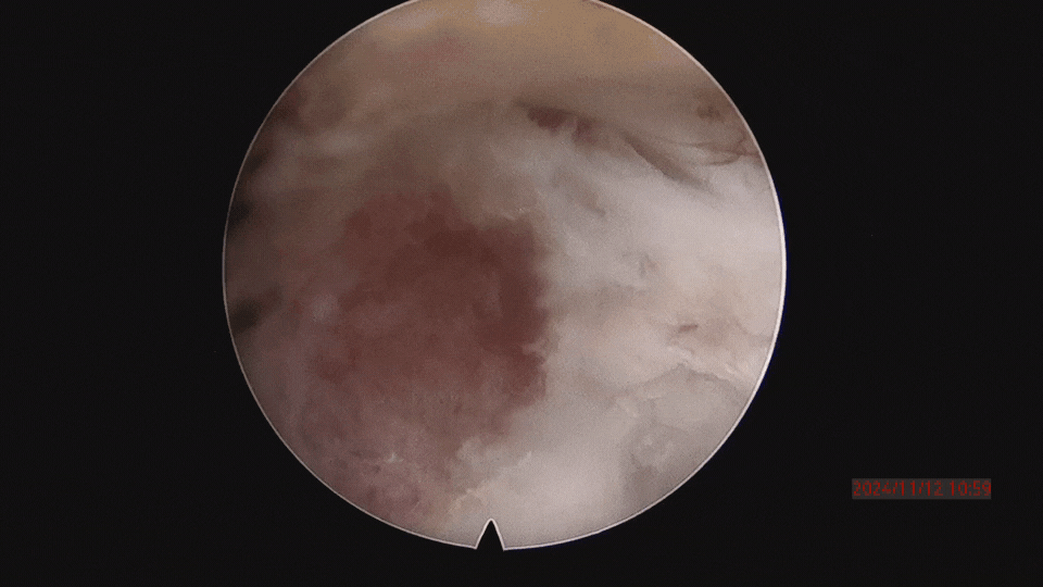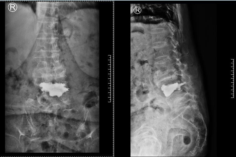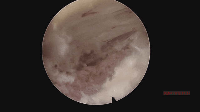 術中,曾小軍先采用骨水泥固定骨折不愈合的骨頭,實施椎體強化術,再采用椎間孔鏡取出第3腰椎位于神經腹側的碎骨快,最后用椎間孔鏡把腰4-5水平壓迫神經的骨頭和韌帶取出,解除了神經壓迫,非常考驗醫(yī)生高超的技術。
