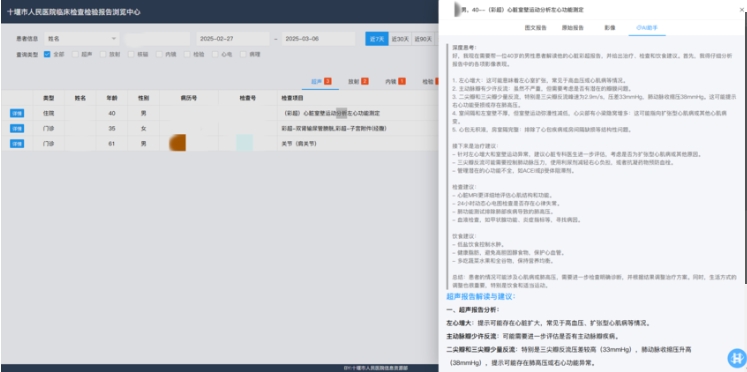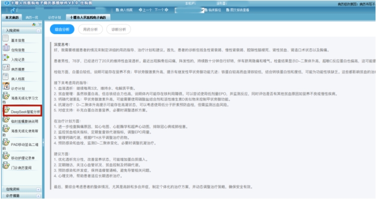 5日,在十堰人醫(yī)電子病歷系統(tǒng)管理后臺中,新增了DeepSeek智能分析功能。當(dāng)輸入患者信息后,系統(tǒng)在不到一分鐘內(nèi)即完成數(shù)據(jù)整合,精準呈現(xiàn)患者的現(xiàn)病史、既往病史及檢查結(jié)果,并基于醫(yī)院積累的百萬級醫(yī)學(xué)數(shù)據(jù)庫,對病例進行綜合分析、用藥分析、診斷分析,為醫(yī)生提供初步診斷意見和治療建議。