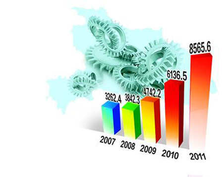 2011年,全省規(guī)模以上工業(yè)增加值跨越8000億元臺(tái)階,達(dá)到8565.6億元,5年年均增長(zhǎng)27.3%。規(guī)模以上工業(yè)增加值占全省GDP的比重達(dá)到43.7%。