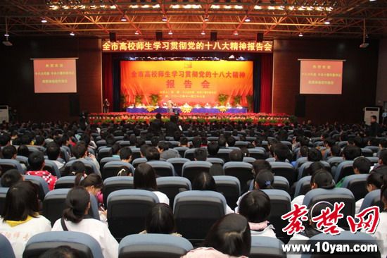 市委書記周霽為高校師生宣講十八大精神 師生們認(rèn)真聆聽 秦楚網(wǎng)訊(十堰日?qǐng)?bào))記者 蘭瑞文 陶德斌 報(bào)道:昨日下午,湖北醫(yī)藥學(xué)院學(xué)子館報(bào)告廳內(nèi)座無虛席,全市高校師生學(xué)習(xí)宣傳貫徹黨的十八大精神報(bào)告會(huì)在這里舉行。十八大代表、十堰市委書記周霽為湖北醫(yī)藥學(xué)院、湖北汽車工業(yè)學(xué)院、鄖陽師專、十堰職業(yè)技術(shù)學(xué)院師生代表及市委黨校教師作了一場(chǎng)生動(dòng)的十八大精神宣講報(bào)告。市委常委、宣傳部長(zhǎng)吳世杰,市委常委、市委秘書長(zhǎng)賀盛有出席報(bào)告會(huì)。