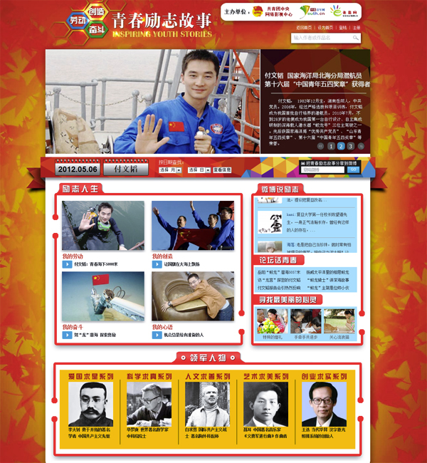“勞動·創(chuàng)造·奮斗——青春勵志故事”網絡文化活動由國家互聯網信息辦公室、團中央、全國青聯指導,團中央網絡影視中心、中國青年網、未來網主辦。主頁由中國青年網承建,從2012年1月1日開始,每天推出一位青春勵志人物,為期一年,全國315家網站同步轉載。據統(tǒng)計,截至2012年12月31日,青春勵志故事欄目在中國青年網上的總點擊量為10.8億,獨立訪問人數達1.2億,頁面瀏覽數(PV)達到4.7億,在新浪、騰訊等全國其他網站上的總點擊量達到50億次以上,唱響了網上學習青春楷模、爭當時代先鋒、爭做有為青年的主旋律。這項活動對加強互聯網時代青少年思想政治教育做了有益探索,是社會主義核心價值觀網上傳播的一次生動實踐,也是加強網絡文化內容建設的重要舉措。