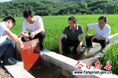 縣水務(wù)局局長萬華(左二)在向農(nóng)民管水員傳授科學(xué)管水知識(shí)